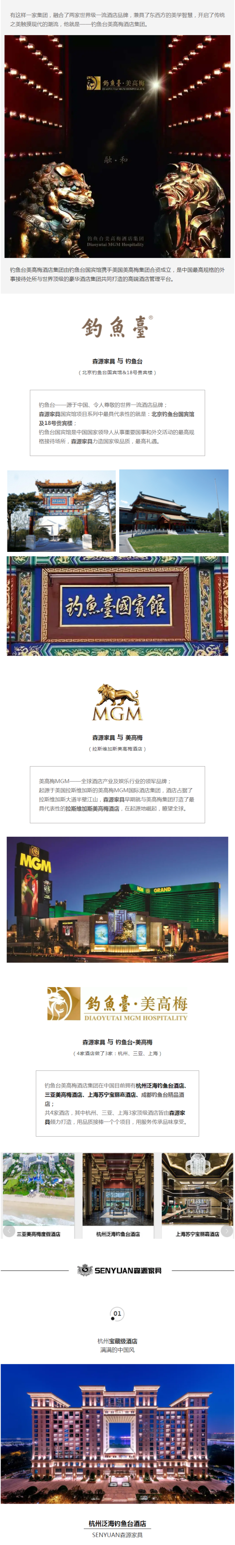森源家具有幸為釣魚臺美高梅酒店集團打造一個又一個頂級酒店,無論是過去,還是現在,直到將來,森源家具都始終堅持品質之路,在每一個時期為頂端酒店、精裝墅宅客戶提供環保、健康、優質的產品及服務!